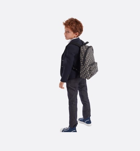 キャンバスと黒い粒の面の小さい牛革のDior Obliqueリュックサックは、「DIOR」ゴムのマークを付けています。