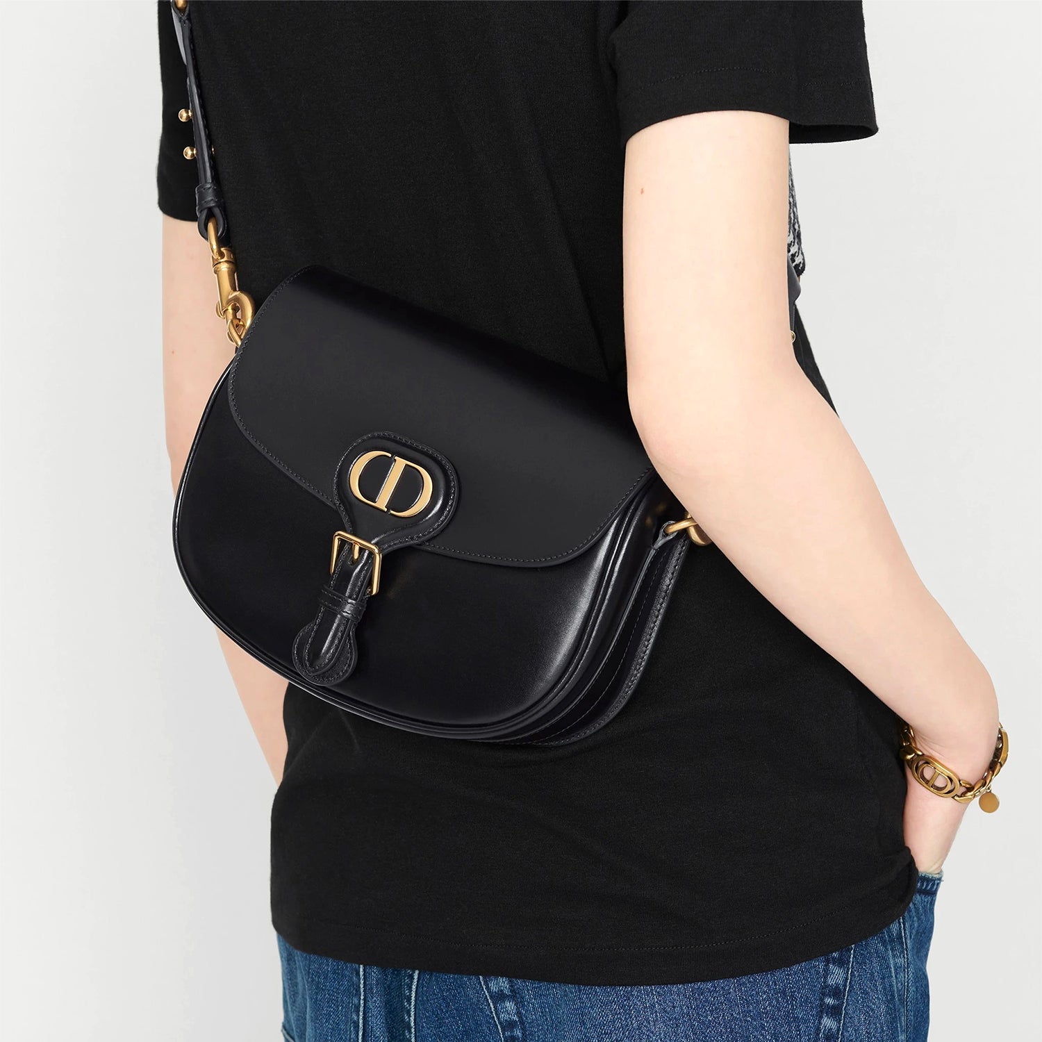 ホーボースタイルの「Dior Bobby (ディオール ボビー)」は、洗練されたラインと均整のとれたシルエットが魅力。ミディアムサイズのモデルは、ブラックのボックスカーフスキンに柔らかなスエードの裏地を組み合わせ、アンティークゴールドトーンのメタルパーツでアクセントを添えました。取り外しと長さ調節が可能なショルダーストラップは、ミリタリー調バックルを備え、ショルダーバッグとしてはもちろん、クロスボディやハンドバッグとしてもお使いいただけます。